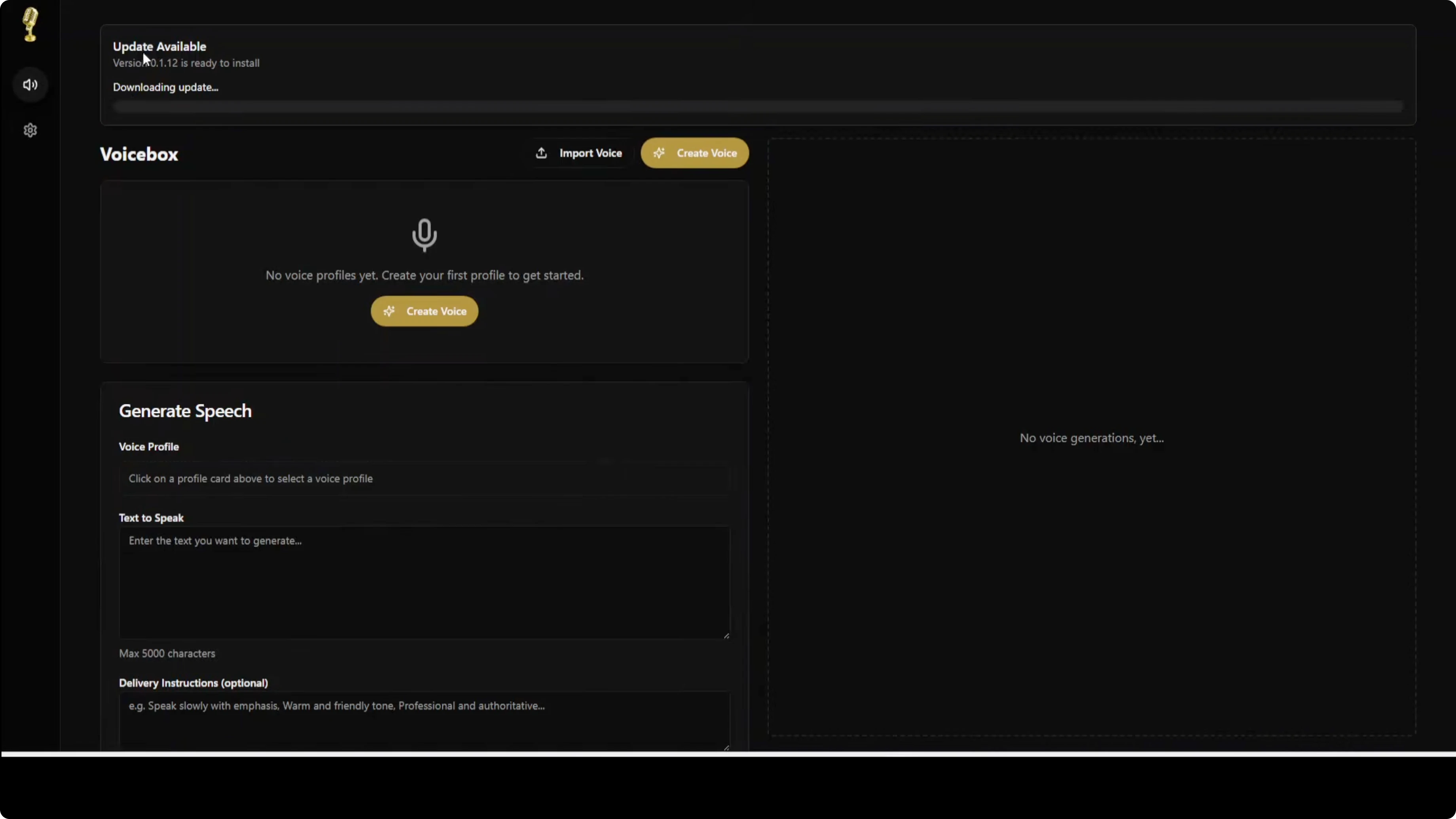 The update process forced an app restart and even rebooted my machine once. The app is early stage, and there are some rough edges, but the core cloning and TTS workflow is functional.