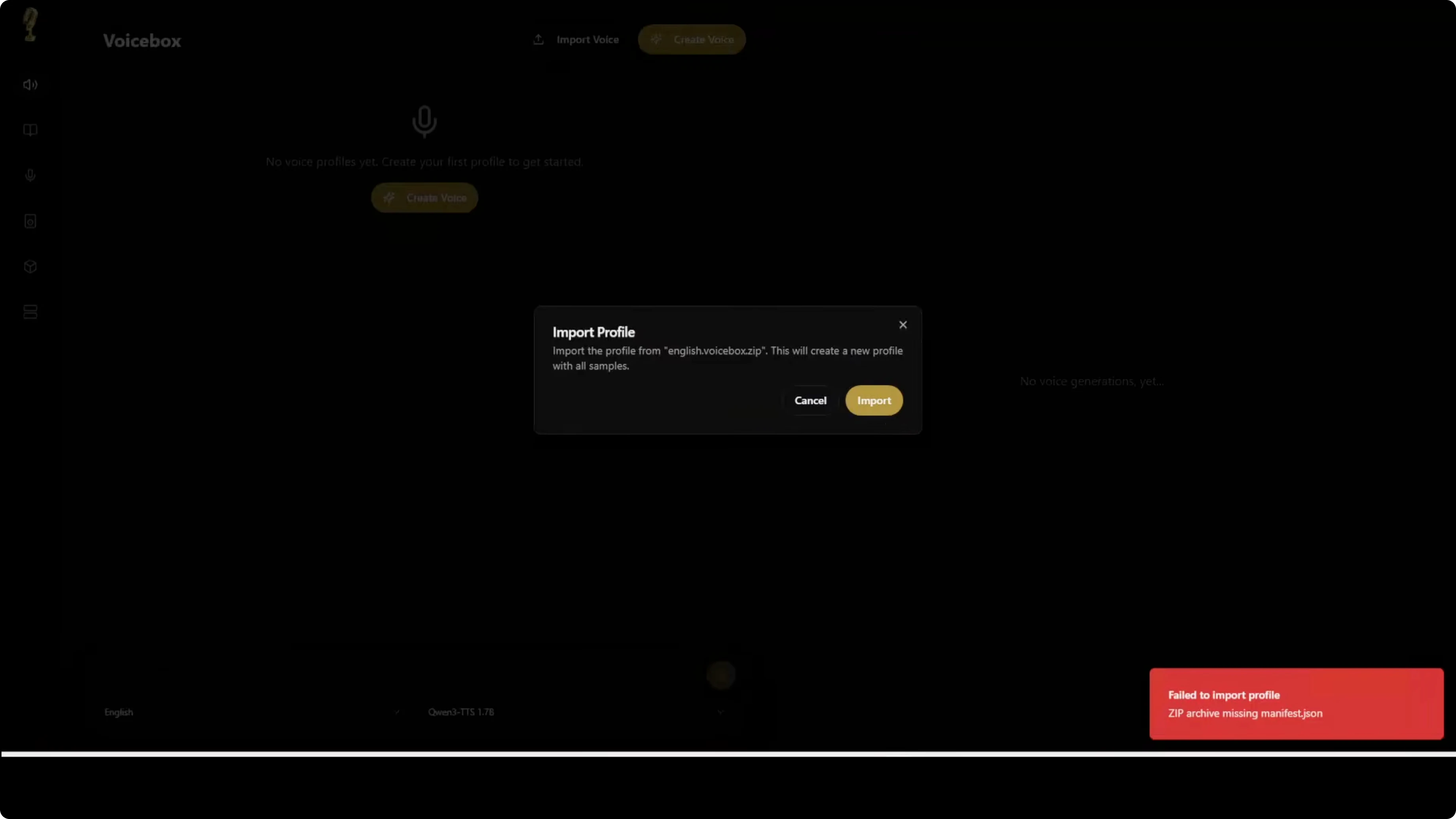 I first tried importing a voice as a zip, but it failed due to a missing manifest.json. From what I can tell, you need to create the voice profile inside Voicebox, then export it to be able to import it later.