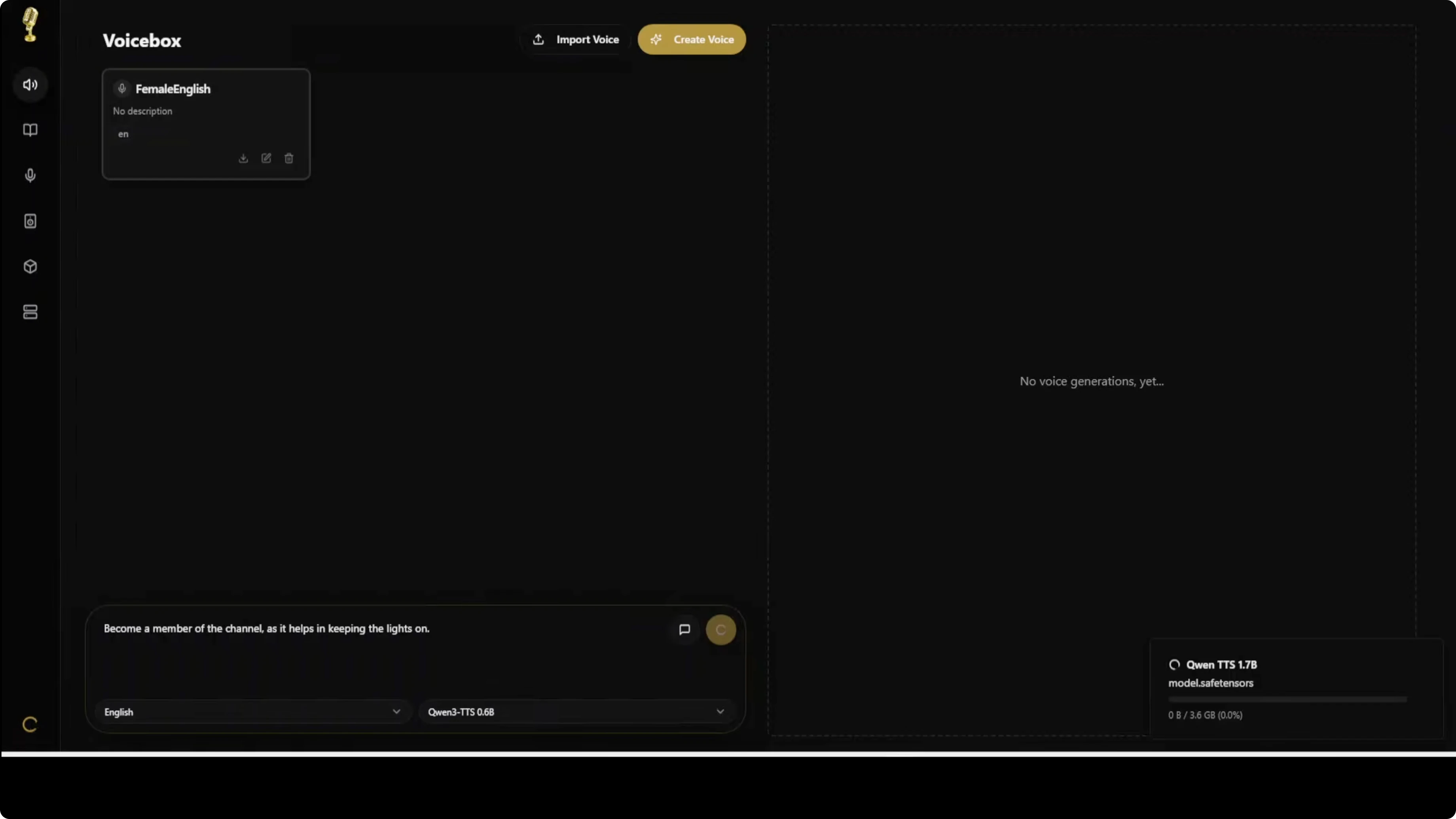 The TTS backend is Qwen3-TTS with 1.7B and 6B options. I selected the 6B model for English on CPU.