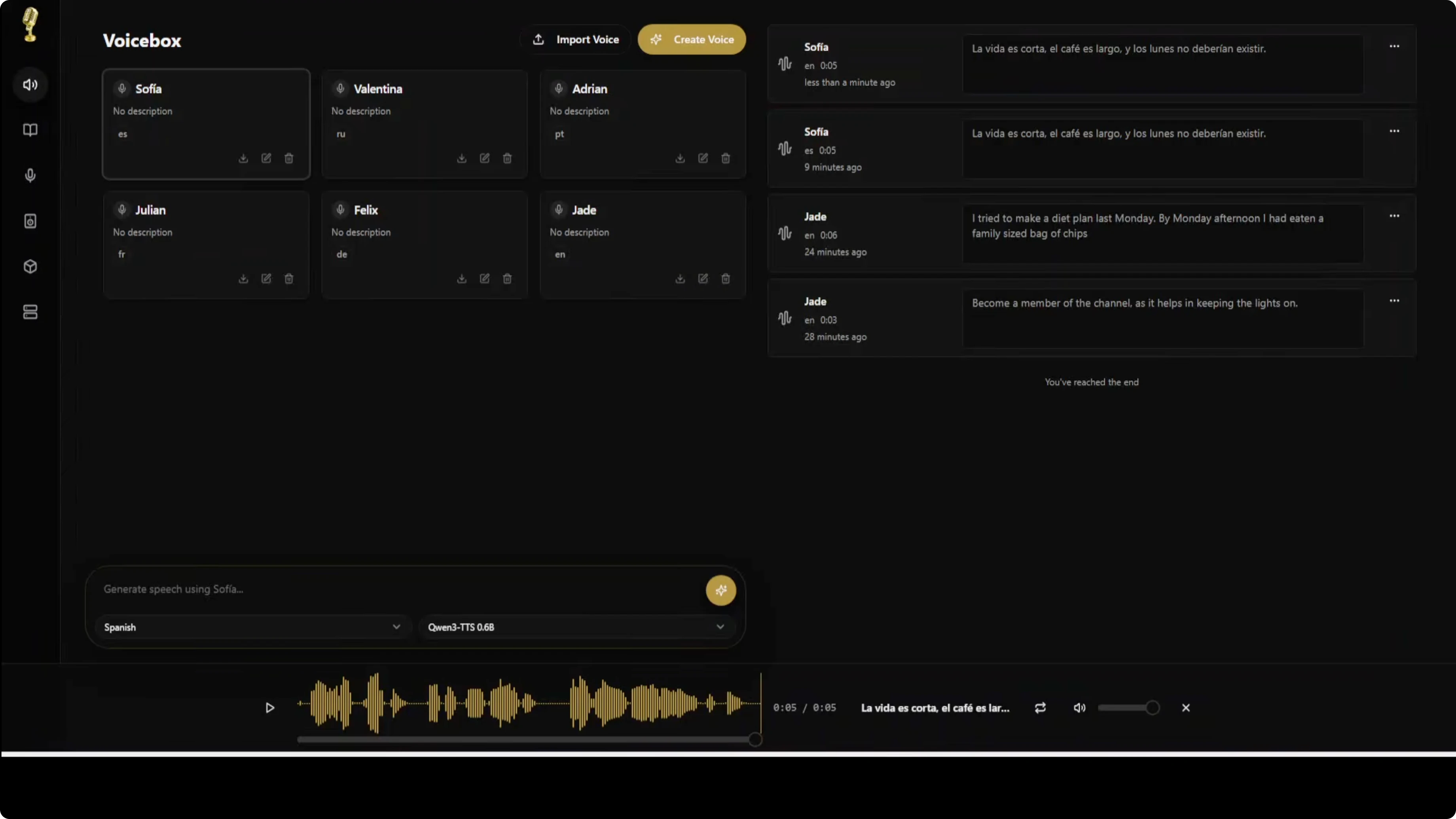 Voicebox keeps a full history of generated audio. You can search and filter by voice, text, or date, and re-generate any past item with one click. This is handy for revisions.