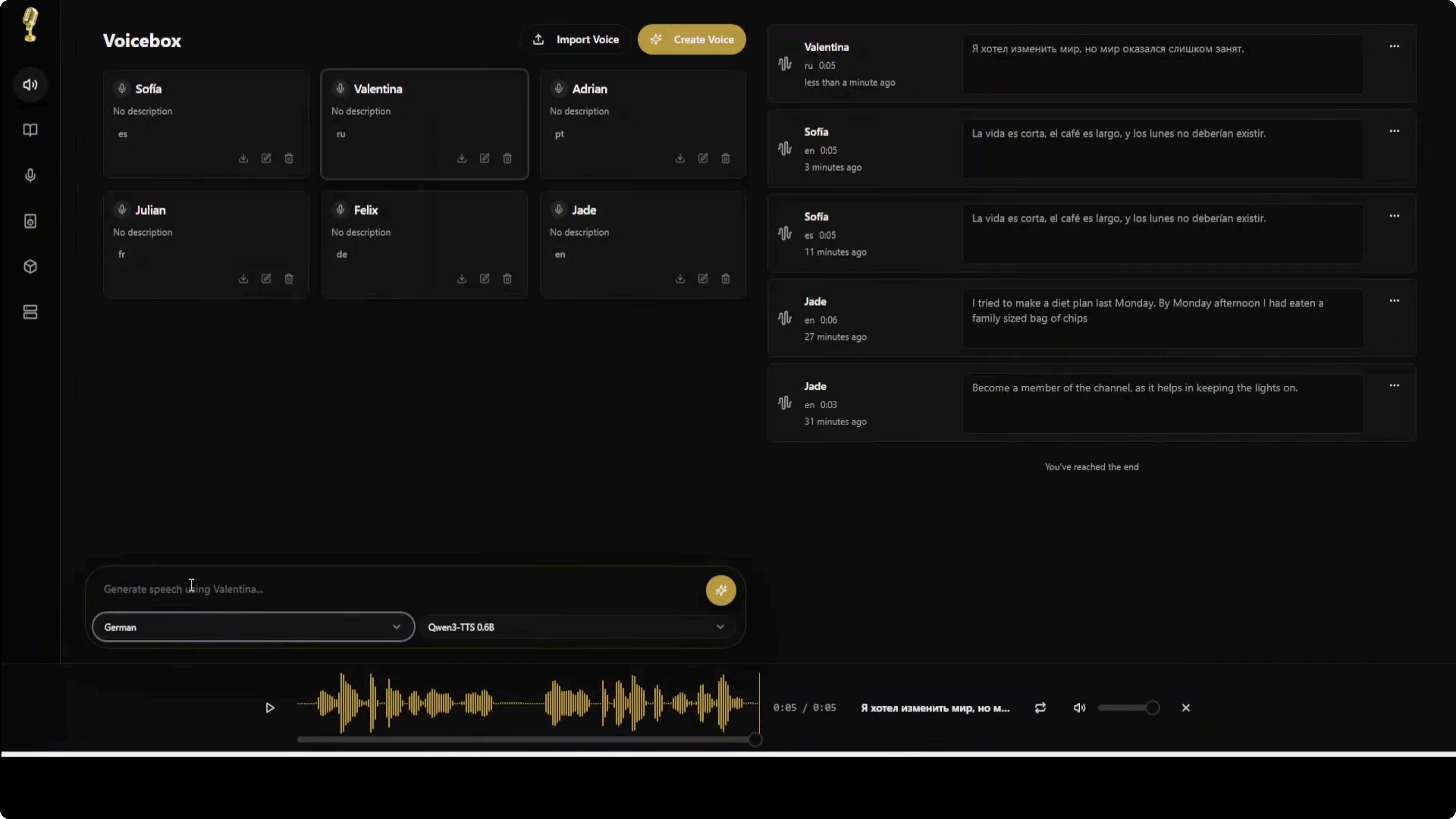 You can run text to speech with any cloned voice. Batch generation helps with longer content, and smart caching lets you regenerate instantly when the same prompt appears. This speeds up iteration.