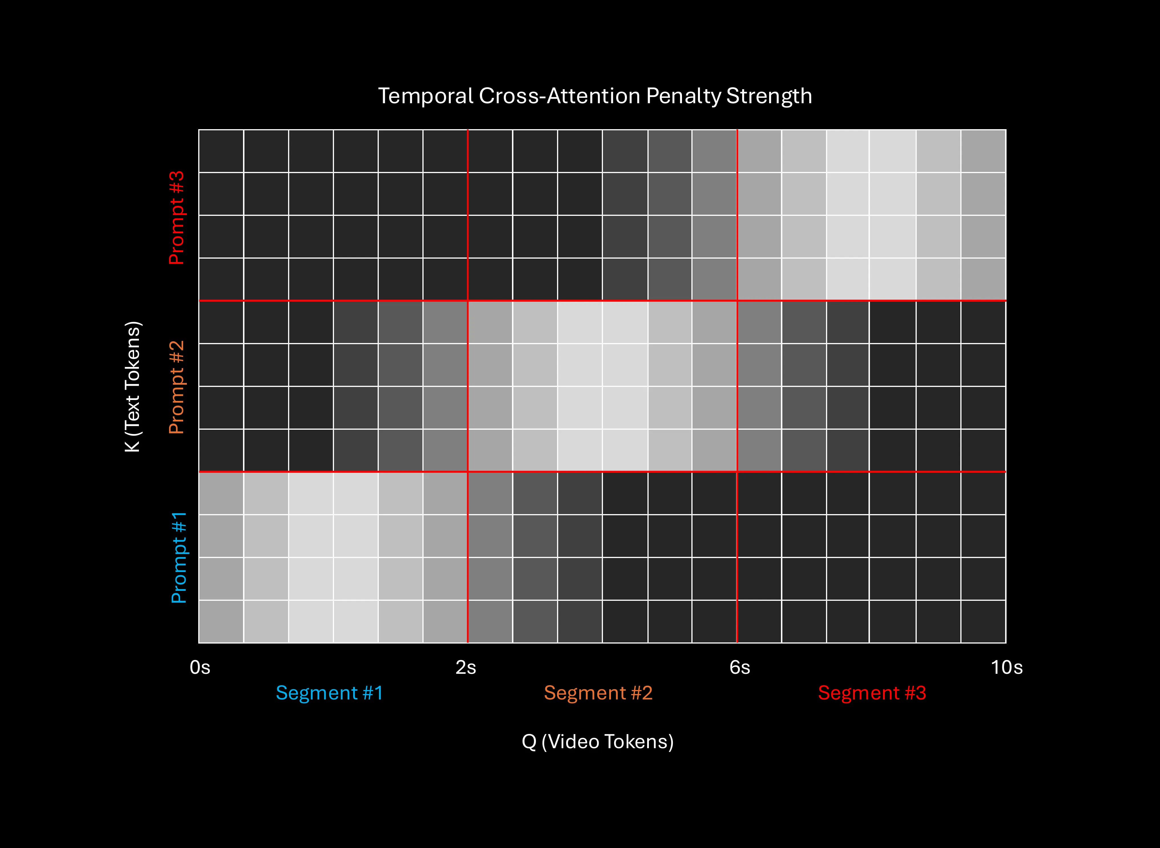 - Route prompts by time: As the video is generated, the system passes control from one prompt section to the next. The active section gets the most attention.