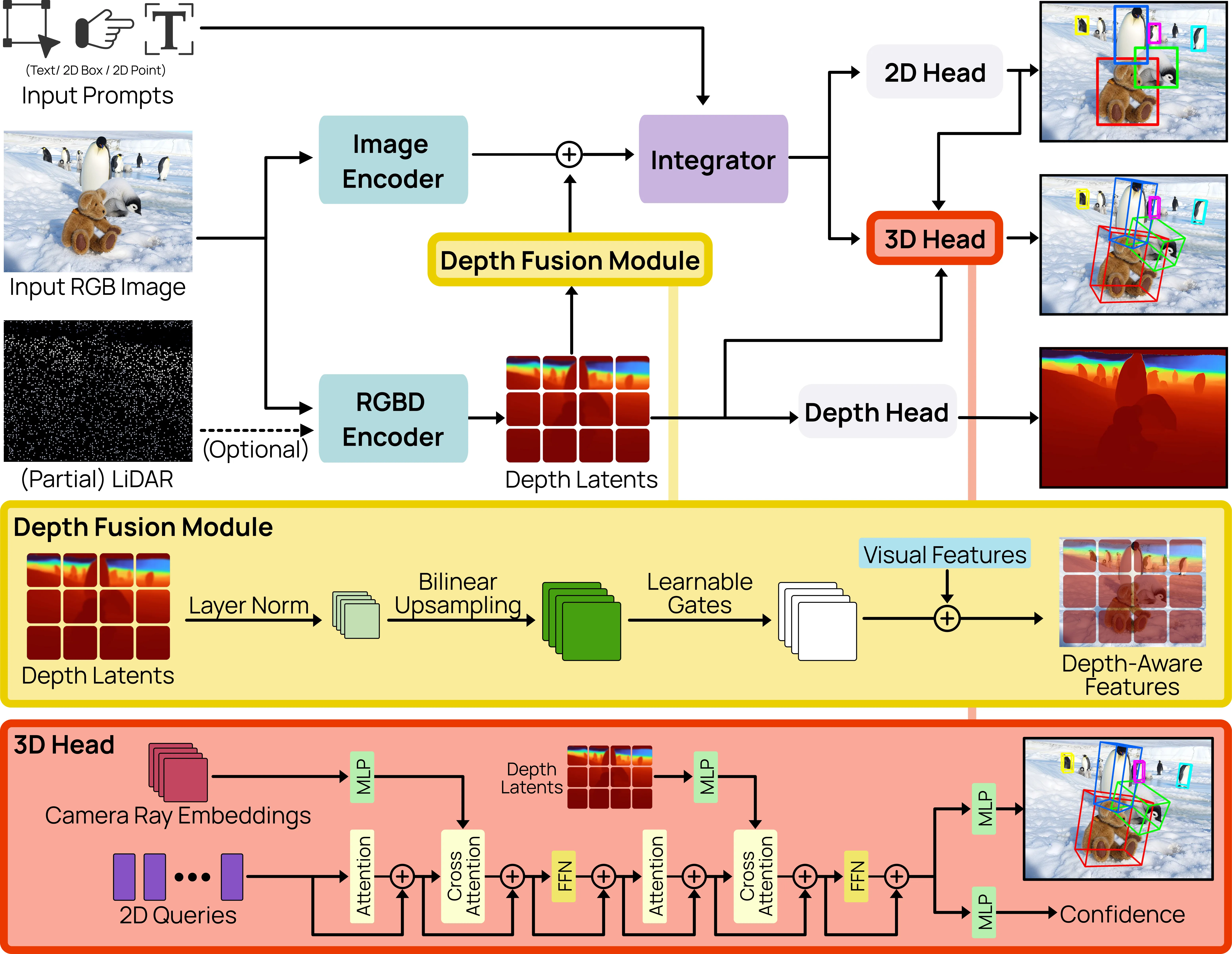 The model uses a prompt friendly detector that unifies text, point, and box inputs. A depth fusion step brings in shape cues when a depth map is given. A final 3D head predicts distance, size, and rotation.
