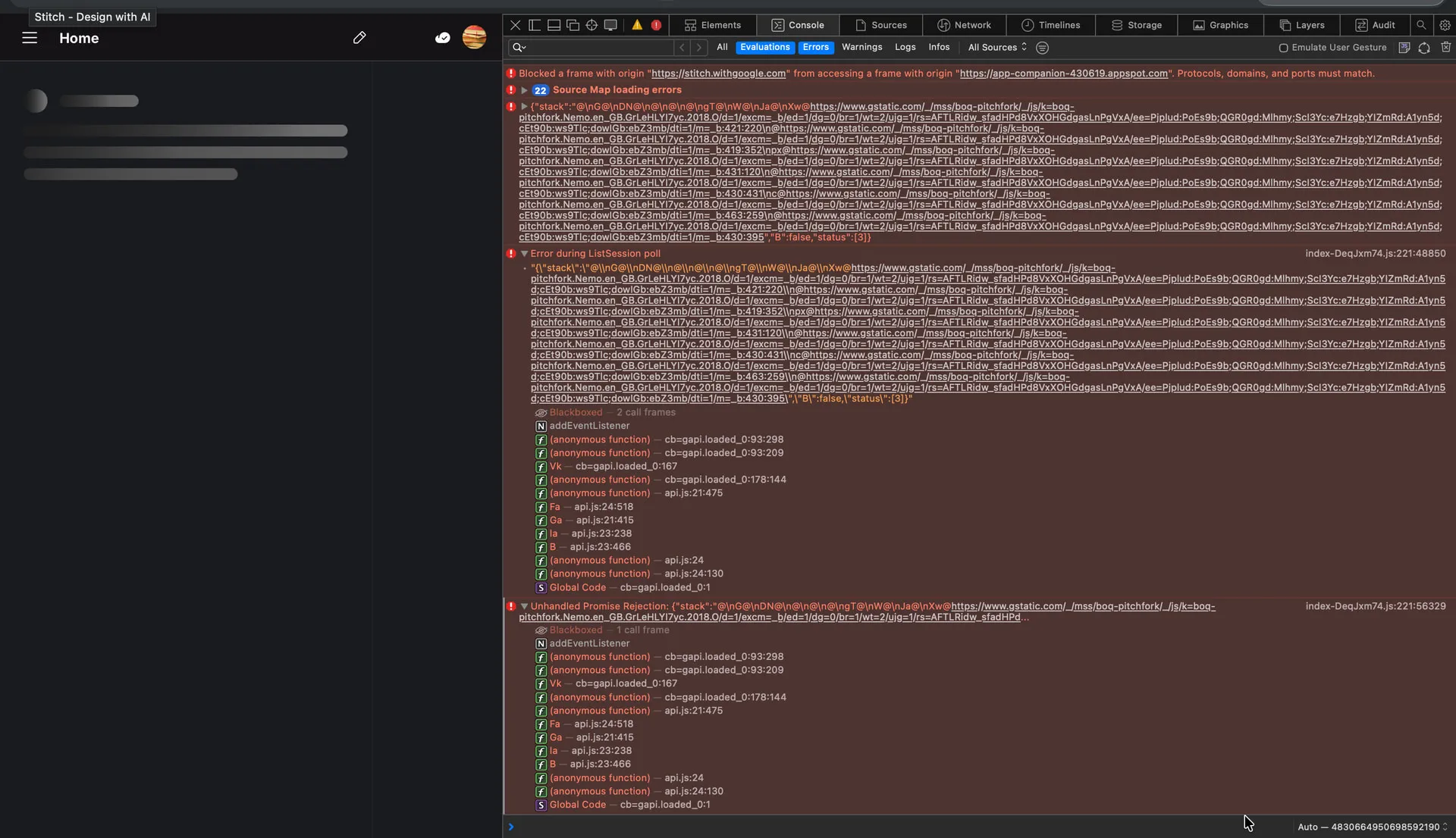 | Primary Fix | Clear site data for the Antigravity/Stitch domain (service worker, caches, IndexedDB, storage), then reopen the project in a clean browser profile |