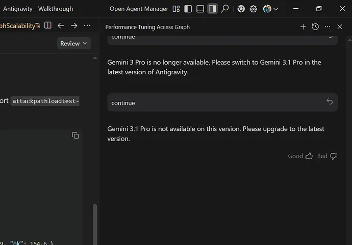 Antigravity shows conflicting messages when you switch between Gemini 3 Pro and Gemini 3.1 Pro. You see prompts like “Gemini 3.1 Pro is not available on this version. Please upgrade to the latest version” and then “Gemini 3 Pro is no longer available. Please switch to Gemini 3.1 Pro in the latest version of Antigravity.”